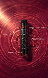 Agua desmineralizada, colágeno marino Peptan® (pescado), concentrado de manzana, fructosa, acidulante: ácido láctico, vitamina C, aroma, gluconato de zinc, conservantes: sorbato de potasio y benzoato de sodio, hialuronato de sodio, edulcorante: sucralosa, colorante: E120, D-biotina (biotina).